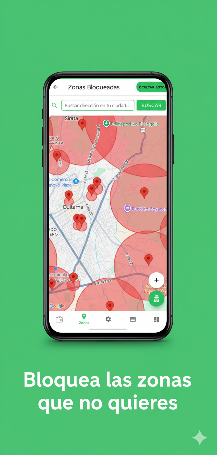 - Zonas bloqueadas / Zonas Diamante / Zonas Gold: Define zonas en el mapa para bloquear solicitudes, o marcar zonas premium (Diamante/Gold) con reglas especiales.